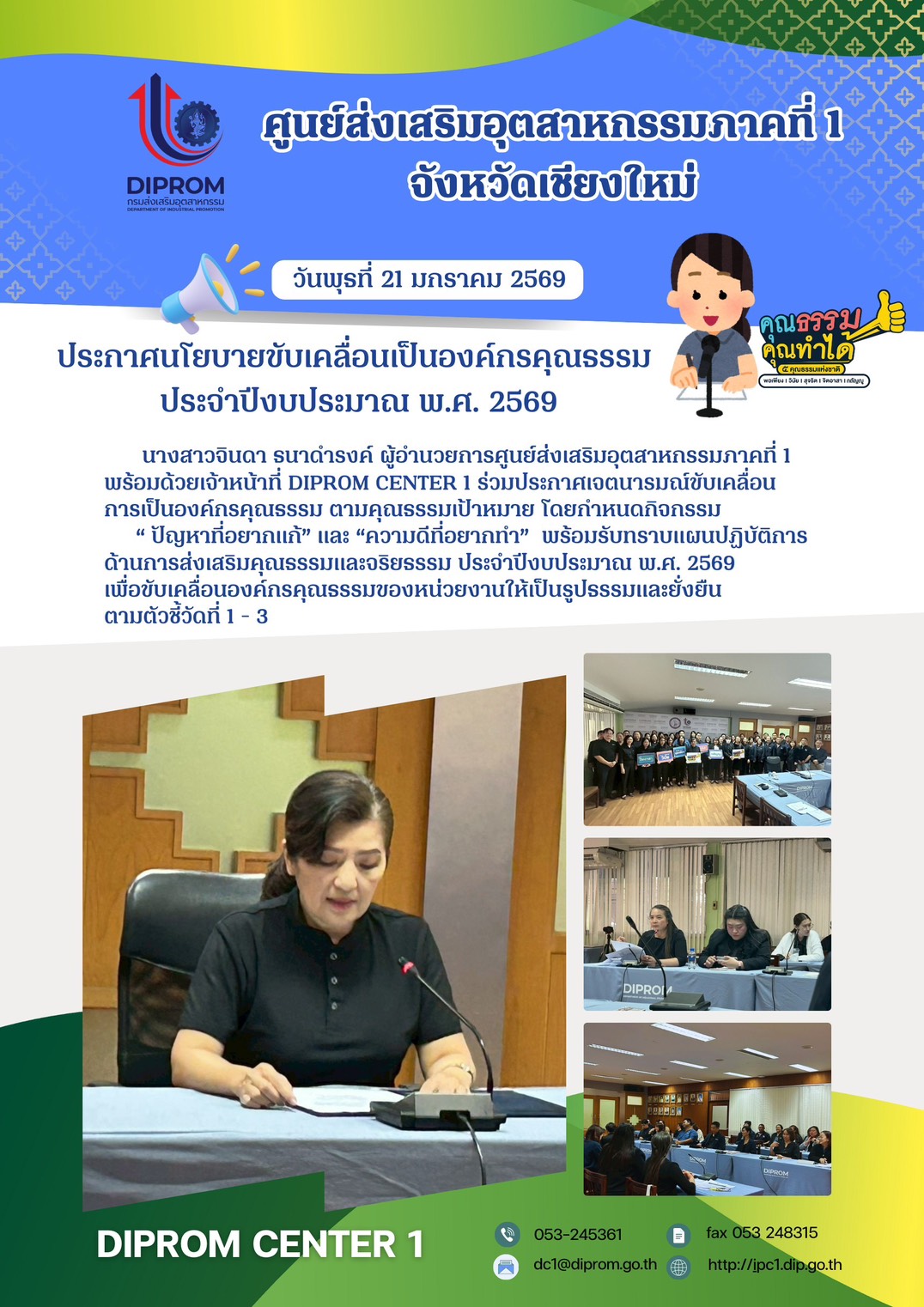ประกาศนโยบายขับเคลื่อนเป็นองค์กรคุณธรรม ประจำปีงบประมาณ พ.ศ. 2569 นางสาวจินดา ธนาดำรงค์ ผู้อำนวยการศูนย์ส่งเสริมอุตสาหกรรมภาคที่ 1พร้อมด้วยเจ้าหน้าที่ DIPROM CENTER 1 ร่วมประกาศเจตนารมณ์ขับเคลื่อนการเป็นองค์กรคุณธรรม ตามคุณธรรมเป้าหมาย โดยกำหนดกิจกรรม“ ปัญหาที่อยากแก้” และ “ความดีที่อยากทำ” พร้อมรับทราบแผนปฏิบัติการด้านการส่งเสริมคุณธรรมและจริยธรรม ประจำปีงบประมาณ พ.ศ. 2569 เพื่อขับเคลื่อนองค์กรคุณธรรมของหน่วยงานให้เป็นรูปธรรมและยั่งยืนตามตัวชี้วัดที่ 1 - 3