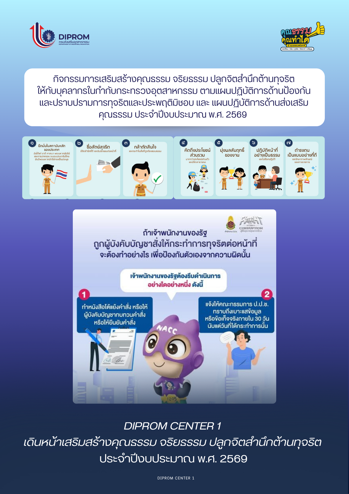 กิจกรรมการเสริมสร้างคุณธรรม จริยธรรม ปลูกจิตสำนึกต้านทุจริตของ ศภ.1 กสอ. มีวัตถุประสงค์เพื่อเสิรมสร้างให้บุคลากรปฏิบัติตนให้มีคุณธรรม จริยธรรมที่พึงมีในการปฏิบัติงาน รักษาคุณงามความดีที่ข้าราชการต้องยึดถือ และปลูกฝังจิตสำนึกในการตระหนักถึงผลกระทบของการทุจริตให้ข้าราชการเกิดสำนึกลึกซึ้งและเที่ยงธรรมในหน้าที่ผดุงเกียรติ และศักดิ์ศรีข้าราชการควรแก่ความไว้วางใจและความเชื่อมั่น